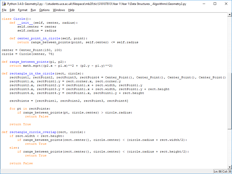 I have designed an algorithm that can tell the user if any number of rectangles intersects a circle. This particular problem asks if multiple rectangles intersects a single circle, which is a good way of representing geometric data. Rectangles can be represented as data by using 2 points of the rectangle for example the top left and bottom right corners, this will tell the user everything about this particular rectangle’s position and shape. Another way to represent a rectangle’s data is by keeping the top left corner’s data especially the width and height of the rectangle. Circles can be represented as data by only 2 things which are the centre point and the radius, this specifies everything about any circle that is produced. In my algorithm there are only two required inputs and one required output. The first input is a list of rectangles which are both represented by two points of the rectangle. This input is required to find out if any rectangle from the given list does or does not intersect a circle. An example of this could be “box1 = Rectangle(100, 200, Center_Point(50, 50))”. The second input is a list of circles which is going to be represented by it’s centre point and radius. An example of this could be “center = center_point(150, 100)” “circle = Circle(center, 75)”. The first output is required to find out if any rectangle in the given list intersects a circle in the given list or does not intersect the circle. An example of this could be “Rectangle does overlap with the circle”.