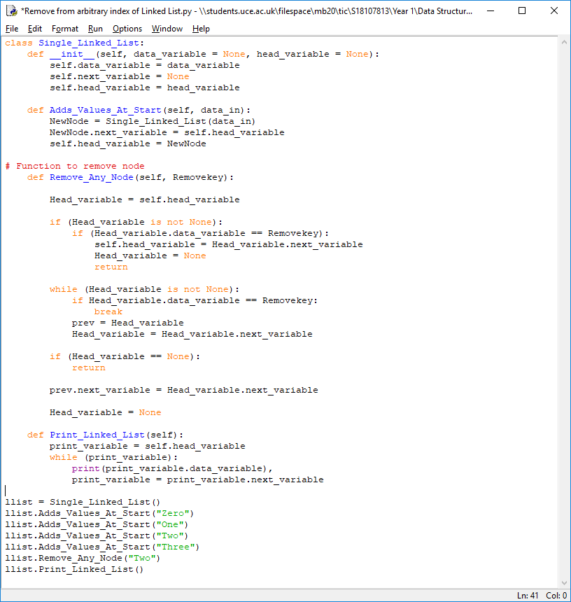 There are 3 steps needed to remove a value from an arbitrary index at any place in the Singly Linked List. The first one is find the previous node of the node to be deleted. The second one is change the next of previous node. The last step is free the memory for the node to be deleted. Below is an example of doing the above function, first I have created a class, then I made a function that will keep adding a value at the start of the list. The next function will remove a specific node and then will print the nodes, last of all it will run the code.