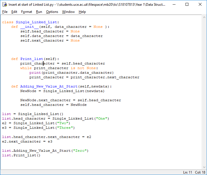 As a Linked List has multiple node elements that are linked together using pointers, it allows the elements to be stored in different locations allowing for a more optimal storage of information. In a singly linked list, each node in the list stores the data and a pointer to the next node in the list, it does not store any pointer to the previous node. To store a single linked list, only the pointer to the first node in that list must be stored. The last node in a single linked list points to nothing. All nodes are allocated space in the memory randomly.
